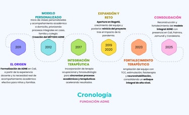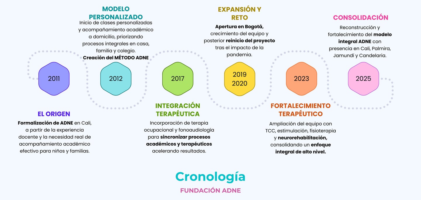 La FUNDACIÓN ADNE es una empresa que nace en el año 2009 a partir de la necesidad de intervenir en el proceso de formación de aquellos estudiantes que requerían apoyo, nivelación o refuerzo en determinadas áreas del conocimiento. Es fundada por las Licenciadas Lady Aguirre Ariza y Cindy Carolina Arroyave Cerón, quienes en busca de un servicio más completo e integral, se han enfocado no solo en ofrecer las clases o terapias requeridas, sino que brindan en ello, la adquisición de excelentes técnicas y hábitos de estudio para que obtengan un aprendizaje realmente significativo, basándonos en la implementación de las inteligencias múltiples y el aprovechamiento de sus capacidades y habilidades. En el año 2011 se da inicio como Taller de Tareas ADNE a un espacio lleno de creatividad y diversión en el momento de ocio de los niños y niñas, en el cual se permite realizar actividades de su preferencia; como pintura, dibujo, cocina, teatro y manualidades; planteando como prioridad el desarrollo del niño y la niña como persona a través de la integración entre movimiento, expresión, comunicación, y pensamiento, para desarrollar en ellos el entusiasmo, la motivación y disposición en todo lo que hacen, formando seres activos, creativos y dinámicos. en el año 2023 nos convertimos en la Fundación ADNE, y a la fecha, formamos un equipo interdisciplinar de profesionales que disfrutamos del acompañamiento afectivo y lúdico hacia nuestros estudiantes, inculcando en ellos hábitos de vida saludable que los lleven al cuidado y conservación de sí mismo, del otro y de su entorno. Por nuestra excelente calidad en el servicio y nuestra excelente calidad humana, somos reconocidos a nivel REGIONAL como una de las mejores opciones que encuentran los padres de familia al requerir el servicio de apoyo académico o terapéutico para sus hijos(as). Adicionalmente y acatando los requerimiento que nos han planteado por distintos medios de comunicación, hemos integrado a nuestro equipo de trabajo profesionales expertos en investigación y diseño gráfico y multimedia, dedicados a realizar asesorías y elaboración de trabajos de grado, así como master en neuropsicología que realizan los diagnósticos especializados y programas de atención diagnóstica para complementar el programa de superación para personas con Necesidades Educativas Especiales. Posteriormente se integraron a nuestro equipo, profesionales en terapia ocupacional y fonoaudiología, esto con el fin último de prestar un servicio integral garantizado, con la misma metodología dinámica de trabajo, el mismo amor y la misma comprensión; con la garantía de un servicio a domicilio que se refleja de inmediato con éxito en el ambiente tanto familiar como escolar. Al realizar las nivelaciones y refuerzos durante varios años, desarrollamos una investigación que nos arrojó como resultado las importantes falencias presentada principalmente en el personal docente que no cuenta con capacitación y competencias para incluir en aulas regulares a niños con algún tipo de discapacidad (ya sea física o cognitiva). Por tal motivo en nuestro ciclo de crecimiento profesional e institucional hemos desarrollado una serie de programas de formación pedagógica y didáctica para diferentes profesionales que tienen su quehacer diario vinculado al ámbito formativo. A partir del año 2015 se inicia una serie de seminarios regionales que promueven la educación inclusiva en todos los niveles. El Seminario Taller de Inclusión Educativa ADNE que se realizó en las ciudades de Palmira, Zarzal, Cali y Popayán dejó importantes experiencias y prácticas educativas que favorecen principalmente a los niños con discapacidades. En estos seminarios presenciales se evidencia un interés amplio en participación no solo de docentes, sino también de terapeutas ocupacionales, psicólogos, enfermeros, fonoaudiólogos entre otros. Por otra parte, evidenciamos la tristeza de personas que por su situación geográfica y económica no podían participar de los talleres, así que, surgió la posibilidad de EDUCACIÓN VIRTUAL, un espacio disponible para el aprendizaje autónomo y práctico de todos aquellos motivados por mejorar sus competencias en el aula para favorecer la educación inclusiva y de calidad. Esperamos continuar con nuestro crecimiento regional y nacional gracias al apoyo tanto de los niños, familias y profesionales que creen en este gran proyecto.